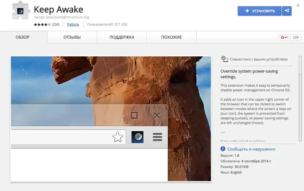 В Google Store существует множество приложений для вашего хромбука, и неудивительно, что среди них можно найти те, которые помогут решить нашу проблему. Keep Awake - простое и эффективное расширение для Chrome, при установке добавляющее новый значок в правый верхний угол окна браузера. Этот значок может меняться на три разные картинки, означающие три режима: